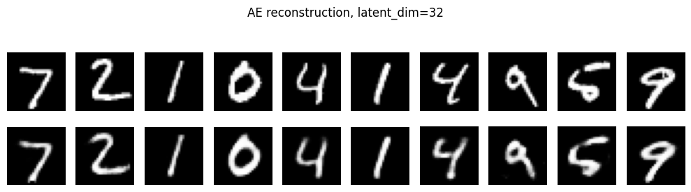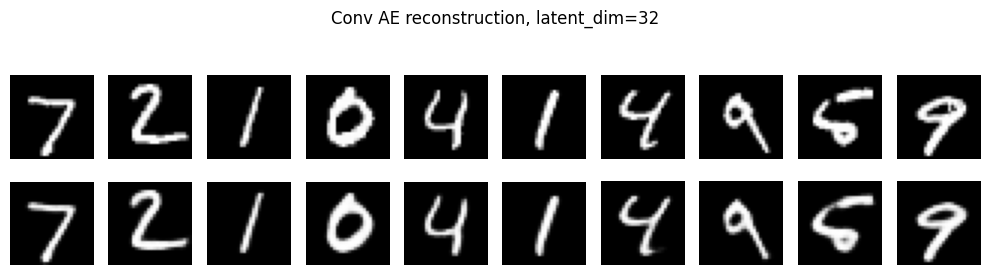 n=10, title=f"Conv AE reconstruction, latent_dim={latent_dim_cae}"