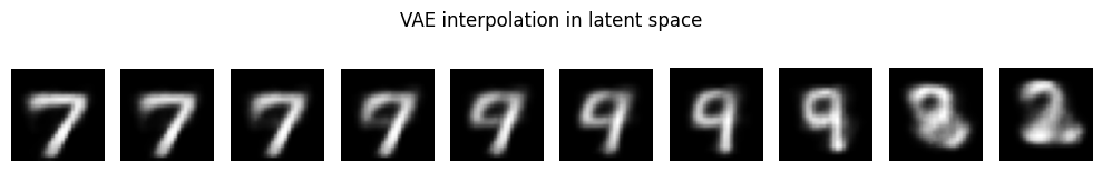 show_images_grid(x_gen, n=10, title="VAE interpolation in latent space")