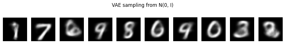“샘플링이 된다”는 의미이다: 오토인코더는 임의의 z를 넣으면 의미 없는 출력이 나올 수 있지만, VAE는 학습 중 KL 항으로 \(q_{\phi}(z|x)\) 가 N(0,I)에 가깝도록 정규화 하기 때문에 N(0,I)에서 뽑은 z가 데이터가 존재하는 잠재공간 영역에 있을 가능성이 커지는 구조이다. 그 결과 디코더가 그럴듯한 숫자 이미지를 생성할 수 있는 상태가 되는 의미이다.