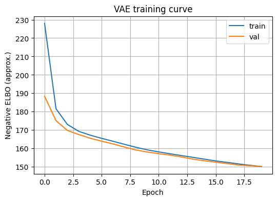 생성된 숫자가 “그럴듯하지만 약간 흐릿한” 이유이다: MNIST VAE는 보통 평균적인 형태를 내는 경향이 있어, 획이 약간 두껍거나 흐릿하게 보이는 경우가 많다. 이는 (a) 재구성 항이 확률적 평균 형태로 학습되는 성질, (b) 잠재공간 정규화(KL 항)로 인해 과도하게 날카로운(세밀한) 복원보다는 “전형적인” 샘플을 내는 방향으로 학습되는 성질 때문이다.