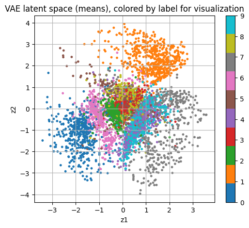 show_images_grid(x_samples, n=10, title="VAE sampling from N(0, I)")이 그림은 VAE가 MNIST 각 이미지를 2차원 잠재변수 \(z=(z_1, z_2)\) 로 압축했을 때, 각 이미지의 잠재분포 평균 \(z_{mean}\) 을 좌표평면에 찍은 산점도이다. 점 하나가 이미지 한 장에 해당하는 표현이며, 색은 학습에는 쓰지 않은 정답 라벨을 시각화 목적으로만 덧칠한 결과이다.