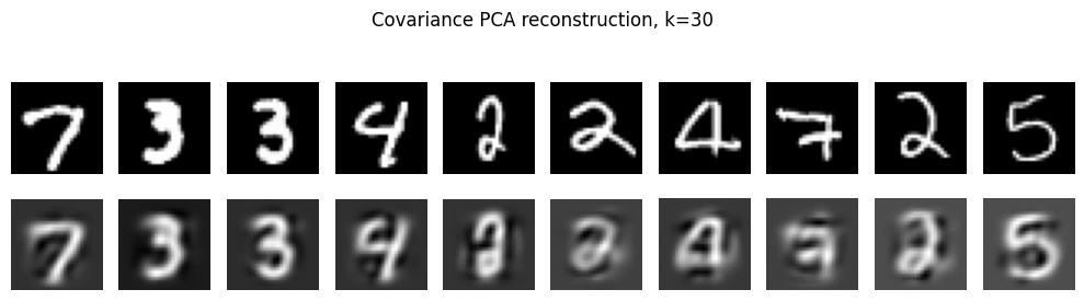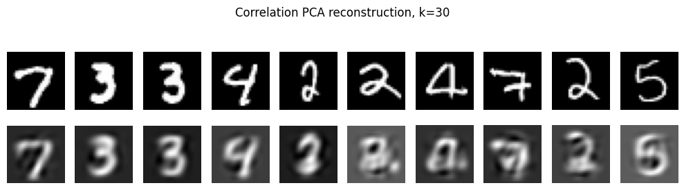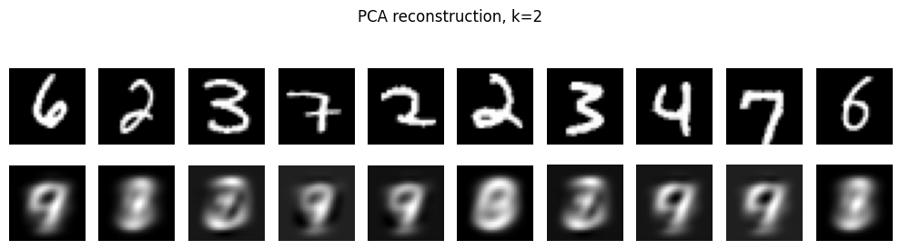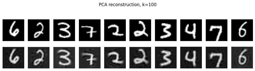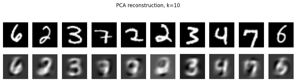 show_reconstructions(x_sample_img, x_hat_img, n=10, title=f"PCA reconstruction, k={k}")