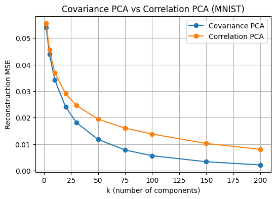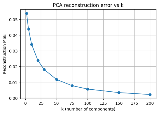 이 셀은 여러 k 값에 대해 재구성 MSE를 계산하여 곡선으로 나타내는 셀이다. 구현은 k 격자를 정하고, 각 k에서 PCA를 다시 적합한 뒤 테스트 일부에 대해 재구성 MSE를 계산하는 방식이다.