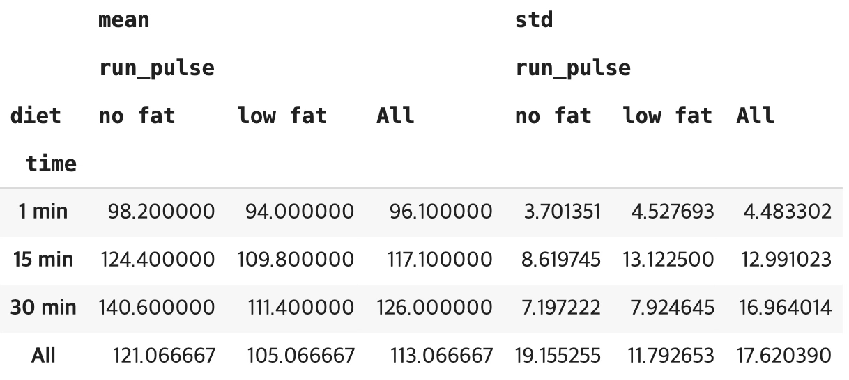 df.pivot_table(index=['time'],columns=['diet'],values=['run_pulse'],aggfunc=['mean','std'],margins=True)