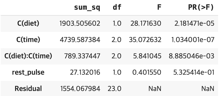 results=ols('y~C(diet)+C(time)+C(diet):C(time)+rest_pulse',data=df).fit()