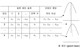 만약 요인이 하나만 있다면, 예를 들어 비료 종류만 비교한다면, 이는 일원배치(one-way classification)이다.