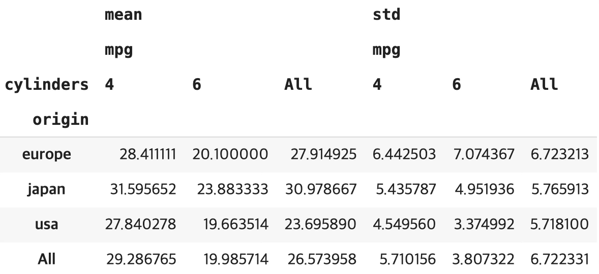 data.pivot_table(index=['origin'],columns=['cylinders'],values=['mpg'],aggfunc=['mean','std'],margins=True)