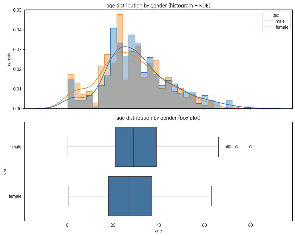 print(f"p-값: {p_val:.4f}")📊 성별 및 통합 평균 나이와 표준편차:
