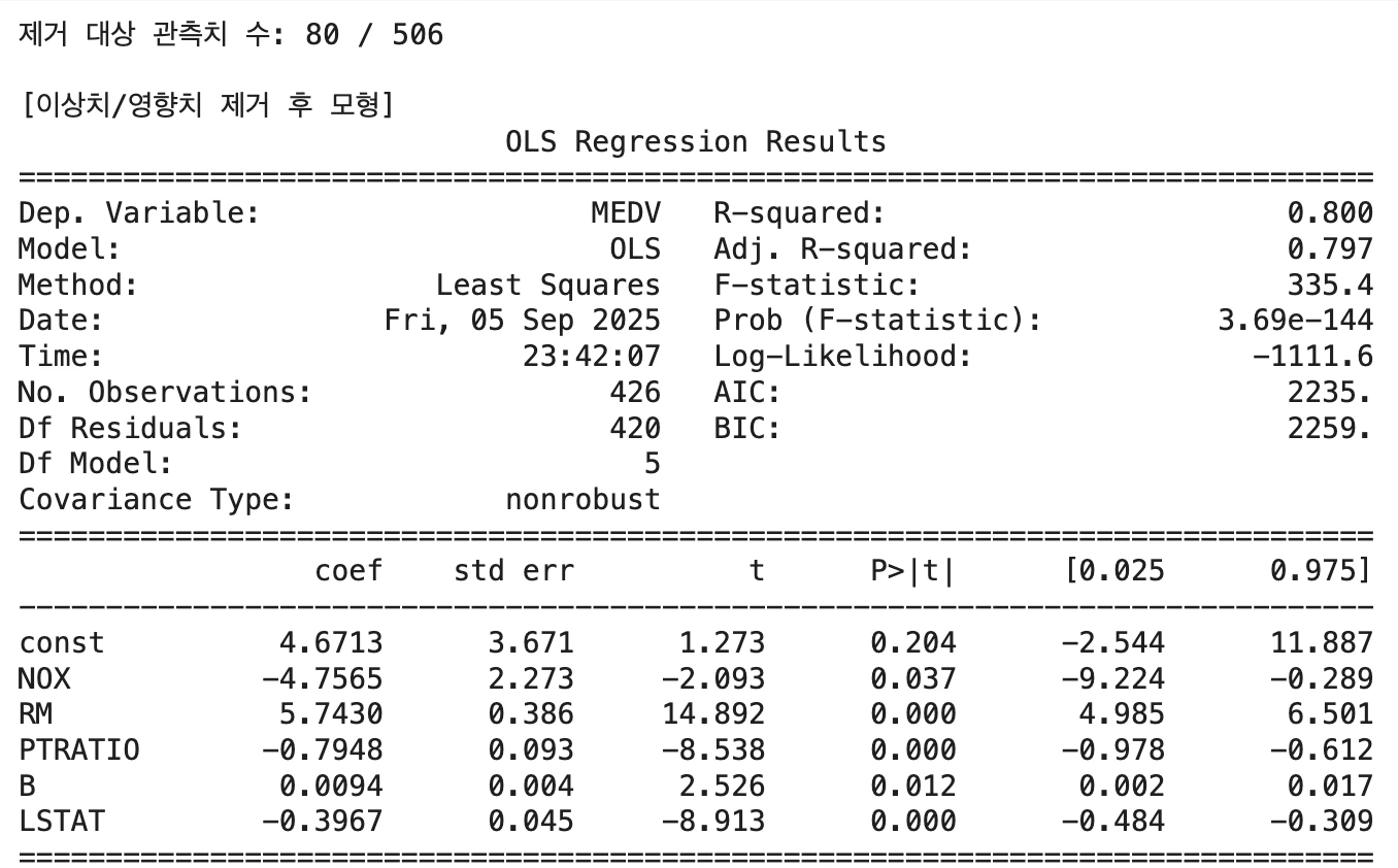 # --- 3. 이상치/영향치 제거 후 모형 재적합 ---