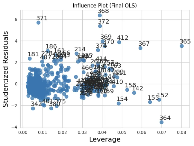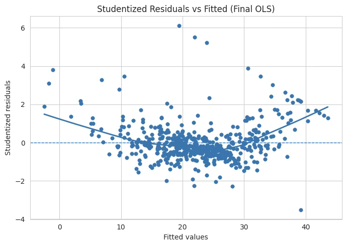 # 1) 진단 그래프 2종: Studentized Residuals vs Fitted, Influence plot