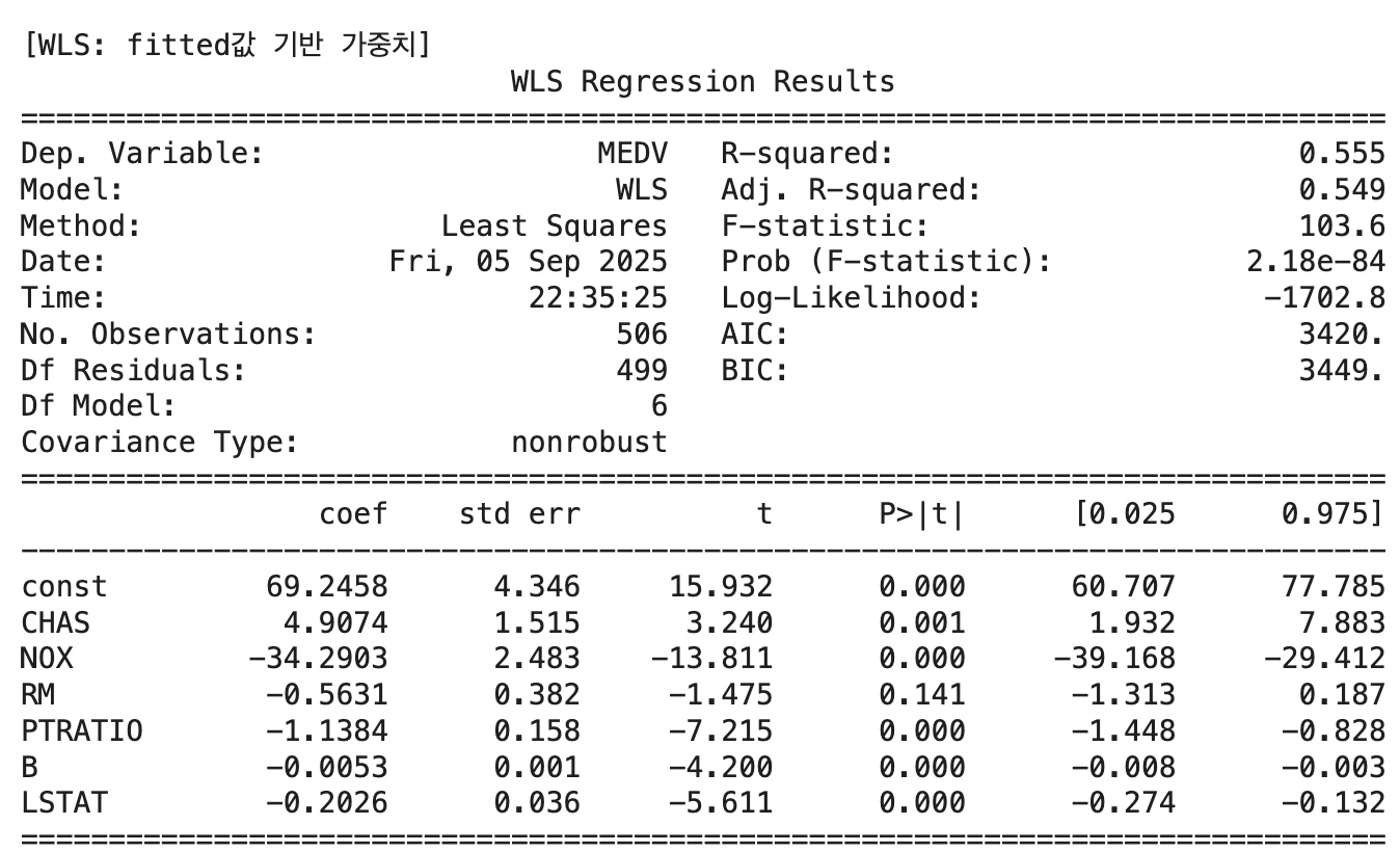 print(refit_model.summary())CHAS의 회귀계수 부호가 상관계수 부호와 상이하여 제거 후 최종 회귀모형을 추정하였다.