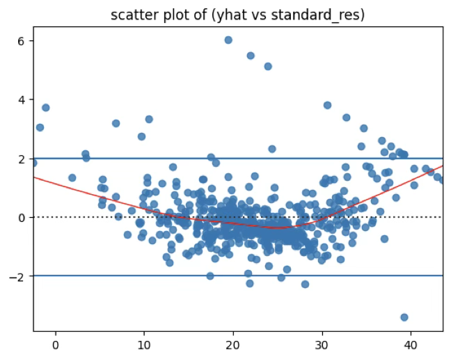 또한 예측값이 커지거나 작아짐에 따라 잔차의 분산이 달라지는 모습이 관찰된다면, 이는 등분산성 가정의 위배를 의미한다. 따라서 잔차 산점도를 통해 선형성과 등분산성을 동시에 진단할 수 있다.