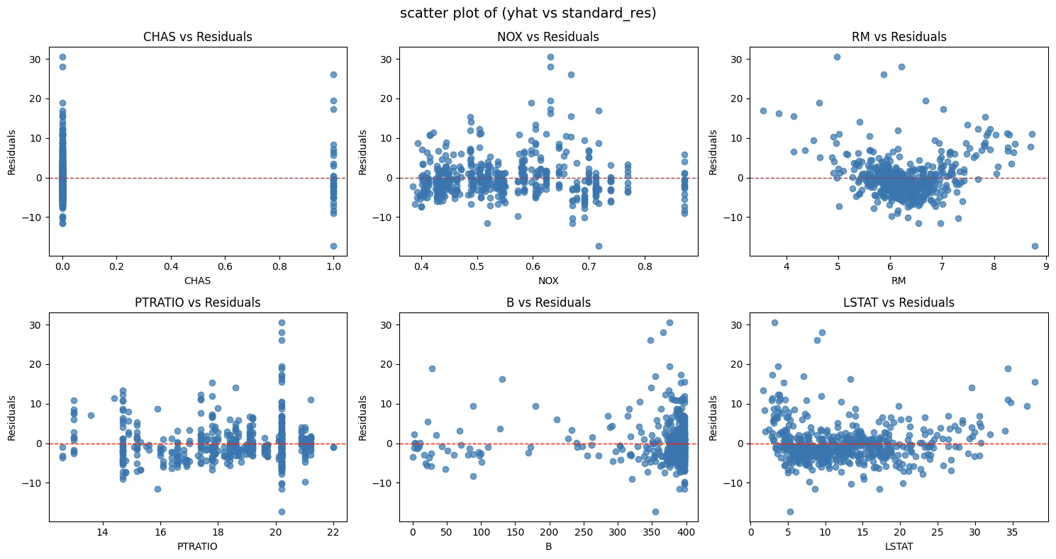 결국 잔차–추정치 산점도는 회귀모형의 기본 가정(선형성, 등분산성) 진단뿐 아니라, 이상치 탐지에도 중요한 역할을 하는 핵심 도구이다.