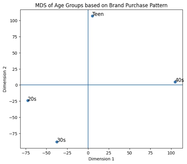 제3차원은 앞선 두 차원에서 충분히 설명되지 않았던 구매 장소와 보조적 선택 요인을 분리하는 역할을 한다. 이 차원에서 shops와 w/lemon은 상대적으로 양의 방향에 위치하여 전문 매장이나 특정 취향 중심의 선택과 연결되는 반면, both와 alone은 음의 방향에 가까워 일상적이고 혼합적인 구매 행태를 반영한다. 제3차원은 전체 구조에서 차지하는 비중은 상대적으로 작지만, 소비자의 미세한 선택 차이를 보완적으로 설명하는 의미를 갖는다.