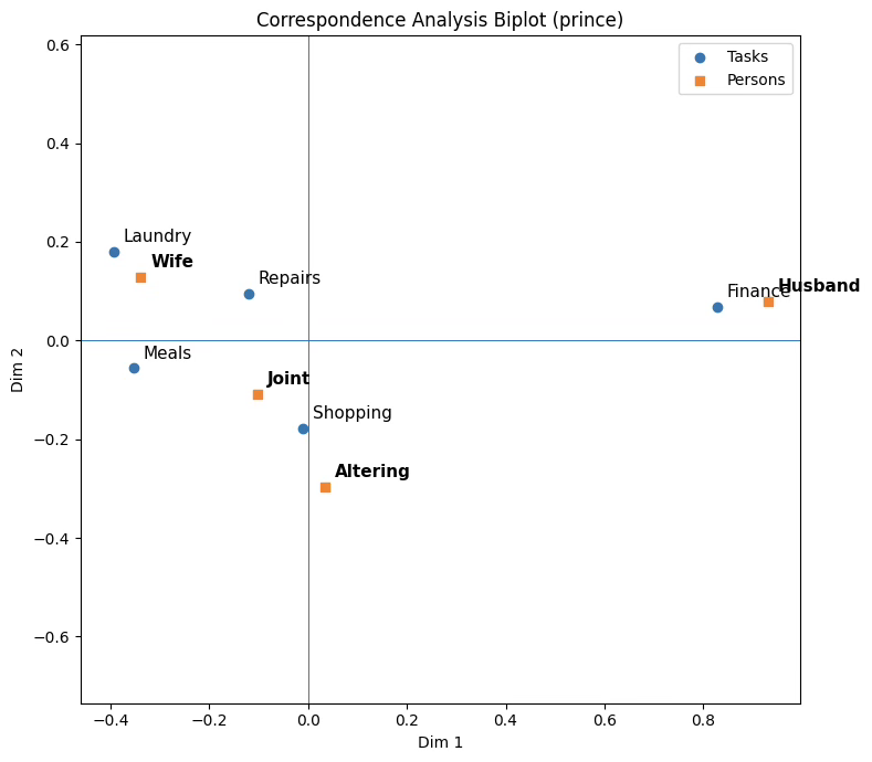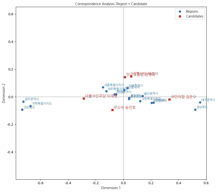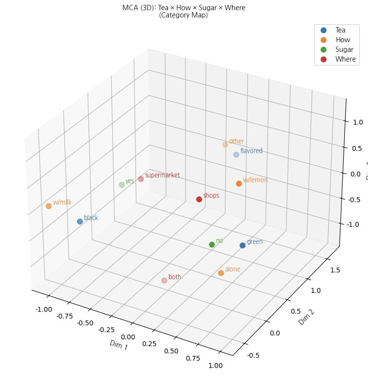 plt.show()본 다차원 대응분석(MCA)은 차의 종류(Tea), 마시는 방식(How), 설탕 첨가 여부(Sugar), 구입 장소(Where)라는 네 개의 범주형 변수가 차 소비 행태에서 어떻게 결합되어 나타나는지를 탐색하기 위해 수행되었다. 분석 결과, 전체 변동은 세 개의 차원으로 효과적으로 요약되었으며, 각 차원은 서로 다른 소비 성향과 맥락을 반영하는 구조적 의미를 갖는다.