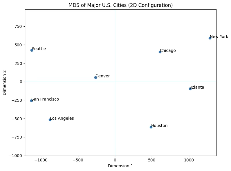 이 도시들 사이의 실제 거리(마일 단위)를 행렬로 구성하고, 이를 MDS에 적용하면 저차원의 좌표를 얻을 수 있다. 알고리즘은 도시 간 거리 구조를 가능한 한 보존하는 방향으로 2차원 공간에서의 위치를 결정하며, 그 결과 도시들이 실제 미국 지도와 매우 유사한 형태로 배치된다.