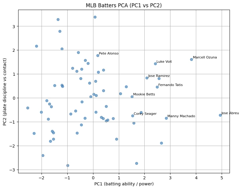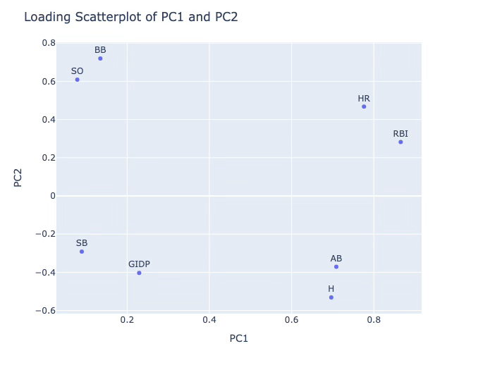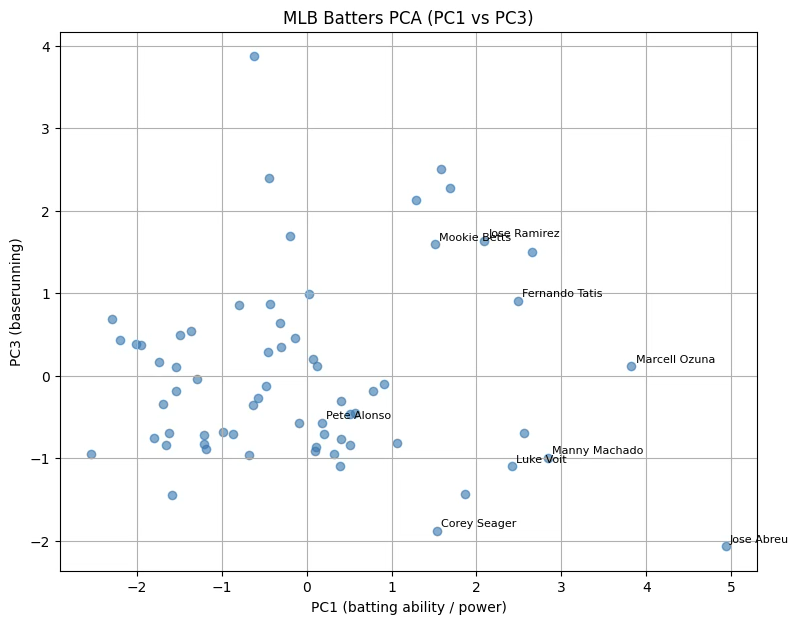 PC2는 볼넷(BB)과 삼진(SO)의 대립 구조로, ”선구안·출루력 vs 컨택 능력”의 대비를 나타내는 축이다. 상관계수 +0.26은 약한 양(+)의 상관으로, 볼넷이 많고 삼진이 적은, 즉 선구안이 좋은 타자일수록 연봉이 높은 경향이 있음을 보여준다. 이는 현대 MLB 시장이 ”출루(OBP)“와 ”타석 퀄리티(plate discipline)”를 일정 부분 보상하고 있음을 시사한다. 다만 0.26 정도면 여전히 제한적 관계이므로, 선구안이 뛰어나도 파워·포지션 프리미엄이 더 큰 영향력을 가질 가능성이 높다.