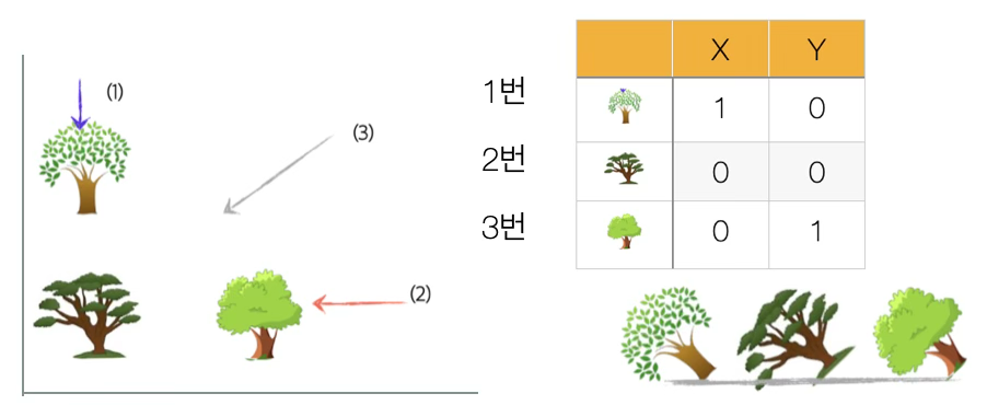 이차원 공간 정보(아래 그림)를 1차원(직선)으로 표시한다면 어디에서 봐야 희생되는 정보(나무의 위치와 거리)가 최소일까? 만약 (1)에서 본다면 1번 나무에 가려 2번 나무는 직선 상에 나타나지 않아 나무가 2개 인 것처럼 보인다. (2)의 관점에서 본다면 역시 3번 나무로 인하여 2번 나무가 가려져 직선 상에 나타나지 않는다.