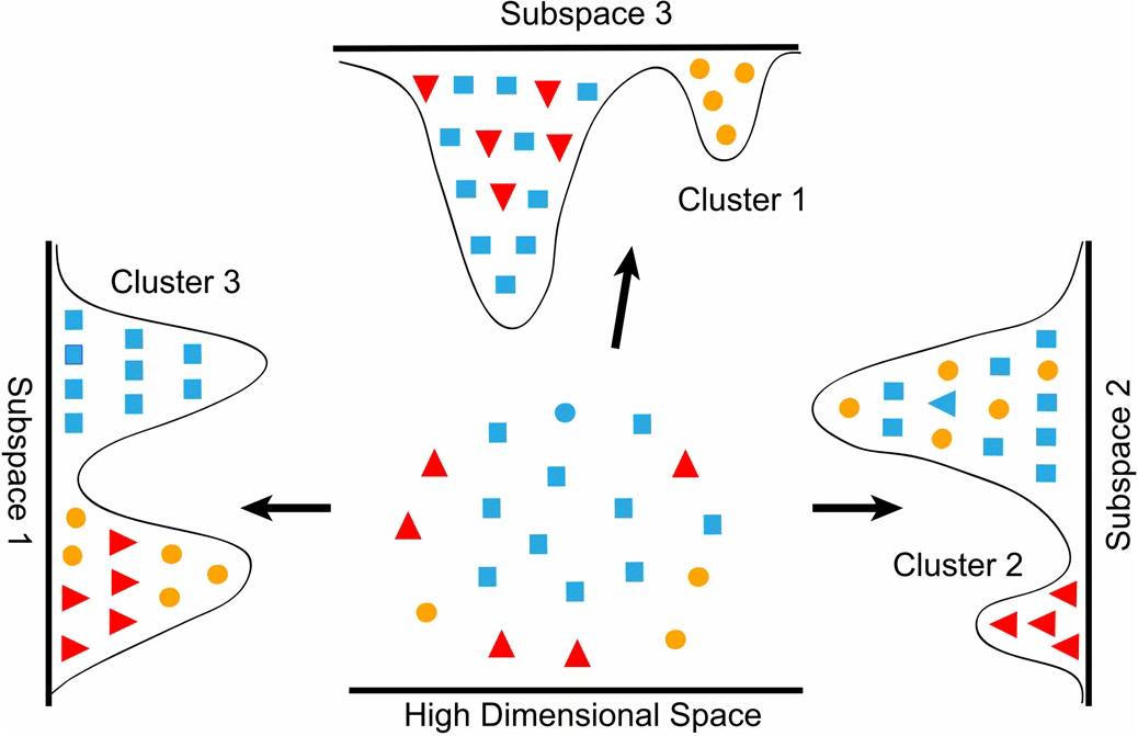 그림의 중앙에 있는 점은 원래의 고차원 공간을 나타낸 것이다. 이 공간에서는 점들이 무질서하게 흩어져 있어 클러스터를 구분하기가 쉽지 않다. 하지만 주성분축(Subspace)으로 투영하면 상황이 달라진다. Subspace 1로 데이터를 비추면 Cluster 3이, Subspace 2로 투영하면 Cluster 2가, Subspace 3에서는 Cluster 1이 명확하게 드러난다. 이는 주성분분석이 데이터의 분산이 큰 방향을 찾아내어 차원을 축소하면서 동시에 데이터의 내재된 구조를 보존한다는 것을 보여준다.