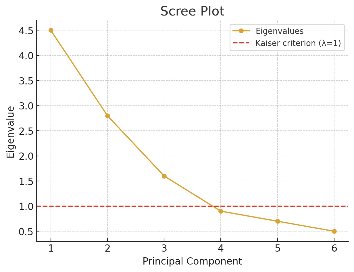 고유값의 크기를 순서대로 그래프에 그리면, 설명력이 급격히 감소하다가 완만해지는 지점이 나타난다. 이 꺾이는 부분(엘보 포인트) 이전까지의 주성분을 선택하는 것이 일반적이다. 아래 그림의 스크리 플롯을 기준으로 할 때, 곡선이 꺾이는 지점인 엘보 포인트는 네 번째 주성분 근처에서 나타난다. 따라서 엘보 기준으로 선택되는 주성분의 개수는 4개이다. 반면 Kaiser 기준(고유값이 1보다 큰 경우)을 적용하면 첫 번째, 두 번째, 세 번째 주성분까지만 선택된다. 따라서 이 경우 Kaiser 기준에 따른 주성분 개수는 3개이다.