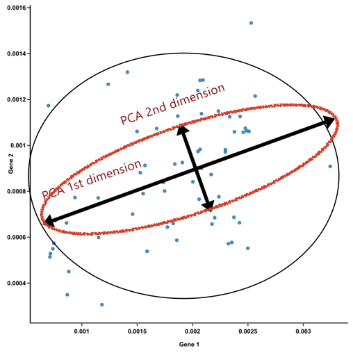 그림 속 원 데이터는 원형에 가깝게 흩어져 있어 X와 Y 변수 간의 상관관계는 거의 0에 가깝다. 두 변수의 분산 역시 동일하기 때문에, 원래 좌표축에서는 특별히 한쪽 축이 더 큰 변동을 설명한다고 보기는 어렵다. 그러나 데이터를 주성분 축으로 회전시키면 상황은 달라진다.