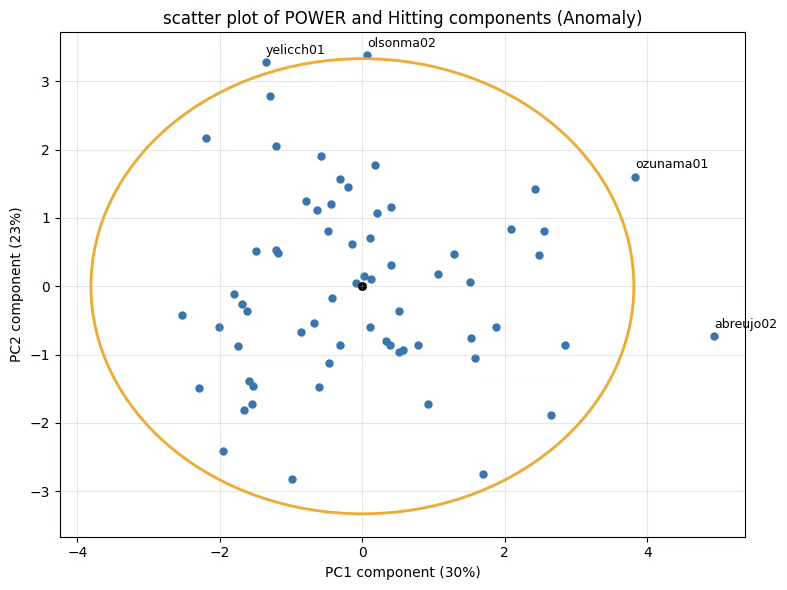 ax.set_title('scatter plot of POWER and Hitting components (Anomaly)')