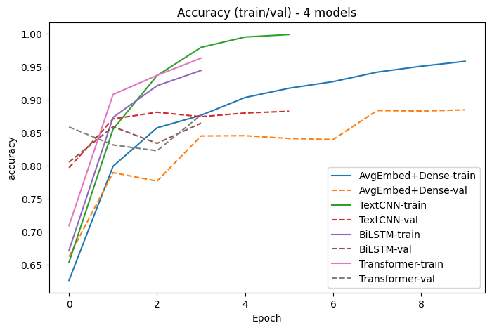 plot_histories(histories, metric="accuracy", title="Accuracy (train/val) - 4 models")