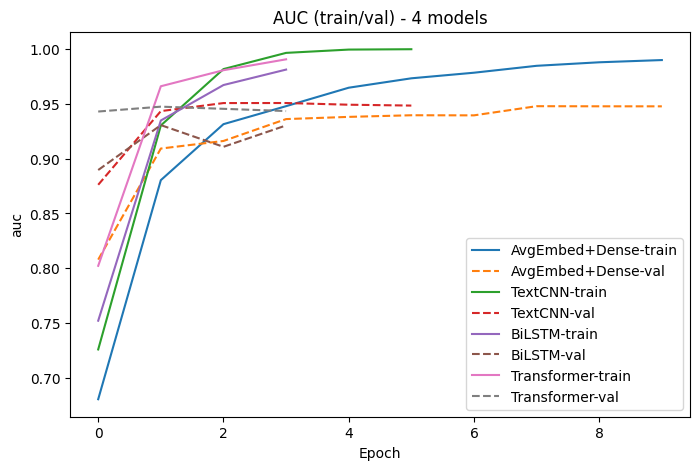 plot_histories(histories, metric="auc", title="AUC (train/val) - 4 models")