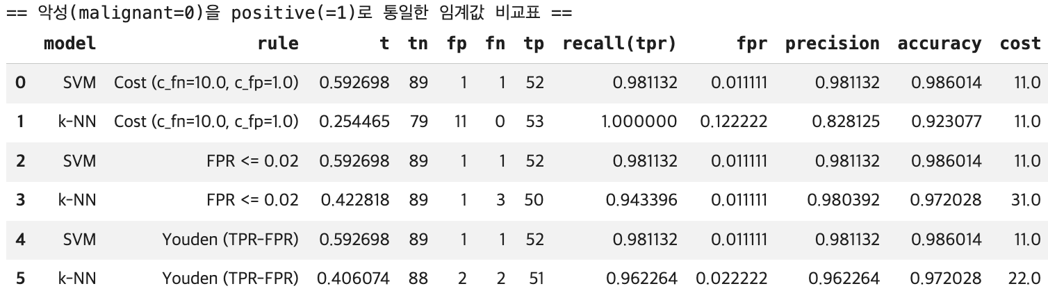 rows += summarize_model(name, y_test_np, score, alpha=alpha, c_fn=c_fn, c_fp=c_fp)