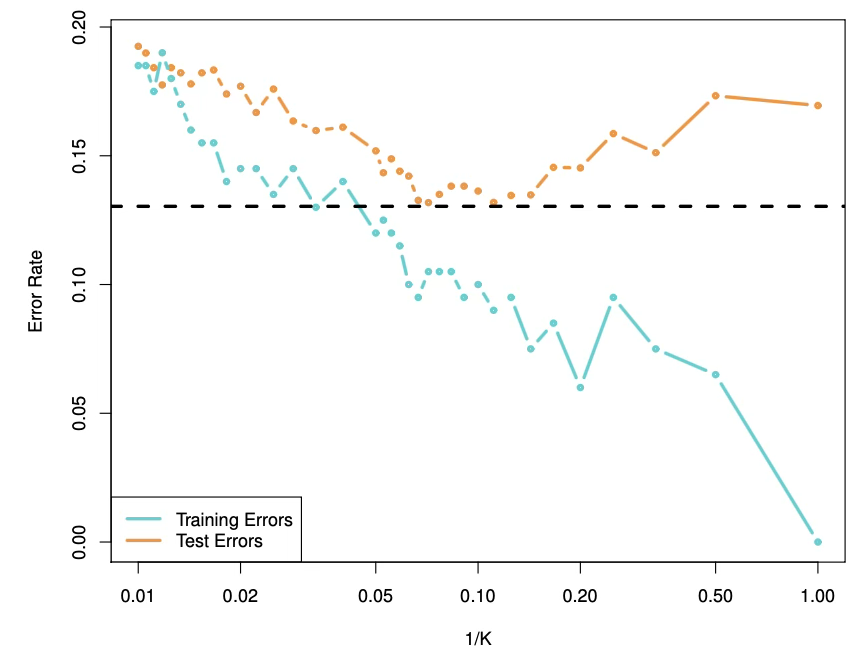 그림의 검은 점선은 베이즈 오류율을 나타내며, 이는 주어진 문제에서 어떤 분류기를 쓰더라도 이론적으로 완전히 없앨 수 없는 최소 오류(불가약 오차)의 기준선이다. 적절한 K를 선택하면 테스트오차가 이 기준선에 가까워질 수 있지만, K가 너무 크거나 너무 작으면 각각 과소적합 또는 과적합으로 인해 테스트오차가 커져 베이즈 오류율과의 차이가 벌어진다. 또한 곡선이 매끈하지 않고 들쭉날쭉한 것은 훈련 데이터가 비교적 작아, K가 조금만 바뀌어도 이웃 구성과 결정경계가 민감하게 변하는 표본 변동의 영향이 나타나기 때문이다.