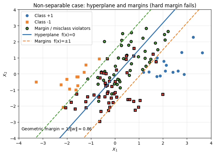 소프트 마진 SVM은 ”마진을 크게 유지하려는 목표”와 ”훈련 데이터의 위반(슬랙)을 줄이려는 목표”를 균형 있게 조절한다. 일반적인 표준 형태(hinge loss 관점)로는 \(\min_{\beta_{0},\beta}\frac{1}{2} \parallel \beta \parallel^{2} + C\overset{n}{\sum_{i = 1}}\max\{ 0,1 - y_{i}f(x_{i})\}\)로 쓸 수 있으며, 여기서 C가 클수록 위반을 더 강하게 벌점하여 훈련오차를 줄이려는 압력이 커진다.