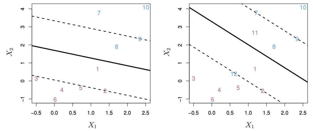 서포트 벡터 분류기의 흥미로운 특징은 서포트 벡터만이 최종 분류기에 영향을 준다는 점이다. 마진의 올바른 쪽에 있는 관측치들은 분류기에 영향을 주지 않는데, 이는 손실 함수가 \(y_{i}(\beta_{0} + \beta_{1}x_{i1} + \cdots + \beta_{p}x_{ip}) \geq 1\)인 관측치에 대해 정확히 0이 되기 때문이다.