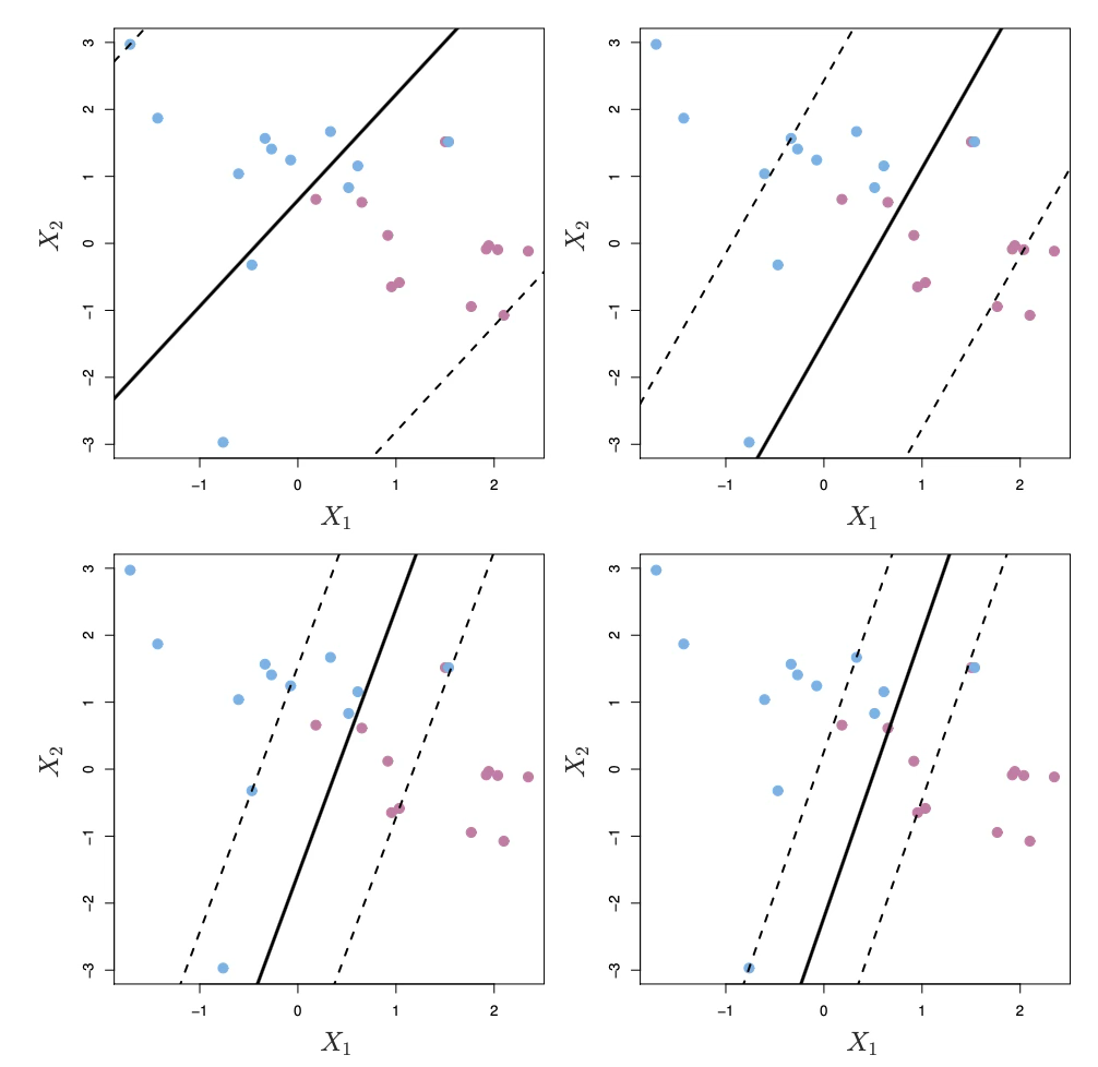서포트 벡터 머신은 최대 마진 분류기(maximal margin classifier)라고 불리는 단순하고 직관적인 분류기의 일반화 형태이다. 이 분류기는 우아하고 단순하지만, 클래스들이 선형 경계로 완전히 분리 가능(separable)해야 한다는 조건을 필요로 하므로, 안타깝게도 대부분의 데이터셋에는 적용할 수 없다는 것을 보게 될 것이다.