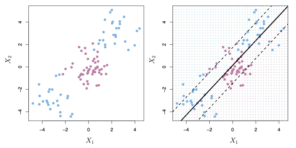 최대 마진 분류기를 확장하여 더 넓은 범위의 경우에 적용할 수 있는 서포트 벡터 분류기(support vector classifier)를 소개한다. 비선형 클래스 경계를 수용하기 위해 서포트 벡터 분류기를 한 단계 더 확장한 서포트 벡터 머신을 소개한다. 서포트 벡터 머신은 기본적으로 두 개의 클래스가 존재하는 이진 분류 설정을 대상으로 한다.