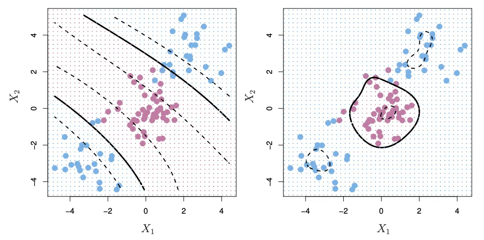 즉, 다항 커널이 고차 다항 특성공간에서의 선형 분리를 암묵적으로 수행한 결과, 원래 공간에서는 ’휘어진’ 경계가 형성된 것이다. 오른쪽 패널은 방사형(RBF, radial) 커널을 사용한 SVM 결과로, 보라색 군집을 둘러싸는 폐곡선 형태의 경계가 나타나며, 이는 RBF 커널이 거리 기반의 국소적 유사도를 이용해 매우 유연한 비선형 경계를 만들 수 있음을 보여준다.