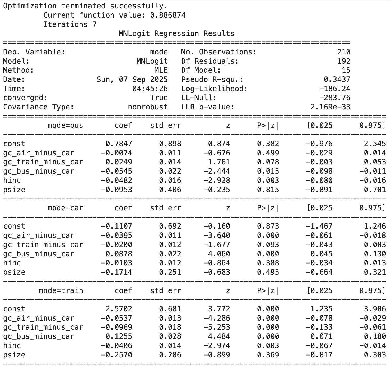 • gc_bus_minus_car (bus eq.) ≈ 0.95: 버스의 일반화 비용이 1단위 증가하면, car 대비 버스 선택 오즈가 약 5% 감소.