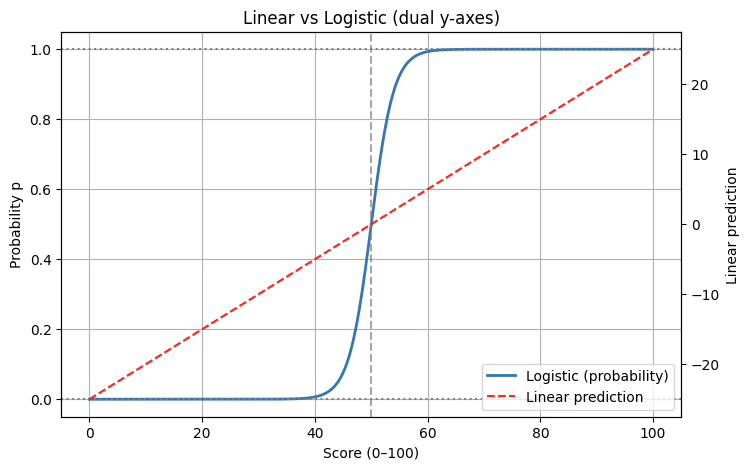 셋째, 선형성 가정이 불합리하다는 점이다. 현실에서 사건 발생 확률은 설명변수가 증가한다고 직선적으로 증가하지 않는다. 보통은 S자 모양의 곡선을 따른다. 즉, 낮은 구간에서는 거의 0에 수렴하고, 일정 구간에서 급격히 증가하며, 높은 구간에서는 다시 1에 가까워지면서 평탄해진다. 하지만 선형회귀는 직선 관계만을 가정하기 때문에 확률의 비선형적 구조를 설명하지 못한다.