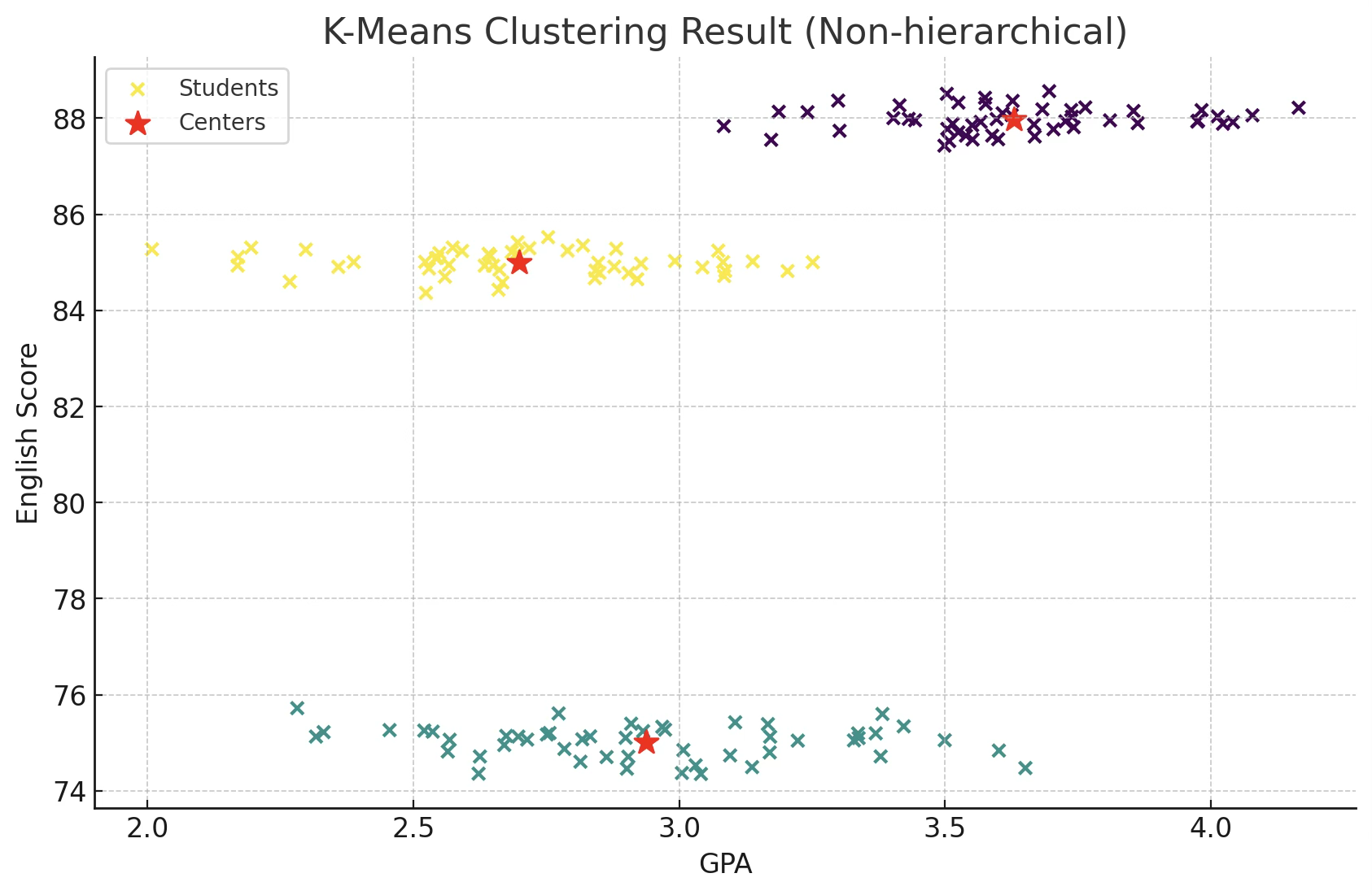 군집분석의 핵심 단계는 개체 간 유사성 계산 → 유사성에 따라 집단을 형성하는 기준 설정 (계층적 또는 비계층적 방법) → 군집의 수 결정 → 각 군집의 해석 및 명명 순이다. 이렇게 형성된 군집은 예를 들어 다음과 같이 해석할 수 있다.