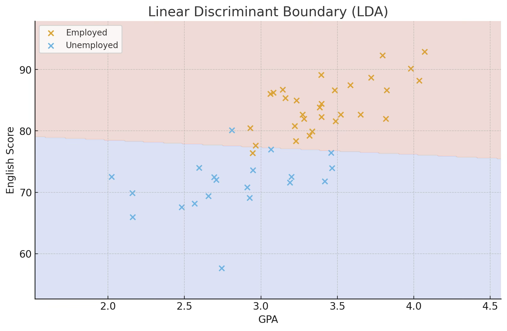 \(D = a + b_{1}X_{1} + b_{2}X_{2} + \cdots + b_{7}X_{7}\), 여기서 D의 값이 기준치보다 크면 ”취업 가능”, 작으면 ”미취업”으로 분류된다. 새로운 졸업예정자에게 7개 변수를 측정하면, 위의 판별식을 통해취업 가능성을 확률적으로 예측할 수 있다. → 즉, 판별분석은 집단 정보(취업 여부)가 사전에 주어진 상태에서 개체를 분류하는 모형이다.