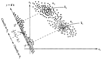 아래 그림은 두 모집단 A와 B가 두 개의 판별변수 (y, z)로 표현된 예이다. 점선으로 표시된 직선은 두 집단을 구분하는 선형 판별규칙이다. 직선 판별선 아래쪽의 히스토그램은 각 집단의 판별점수 분포를 나타내며, 빗금친 부분이 오분류 확률을 의미한다.
