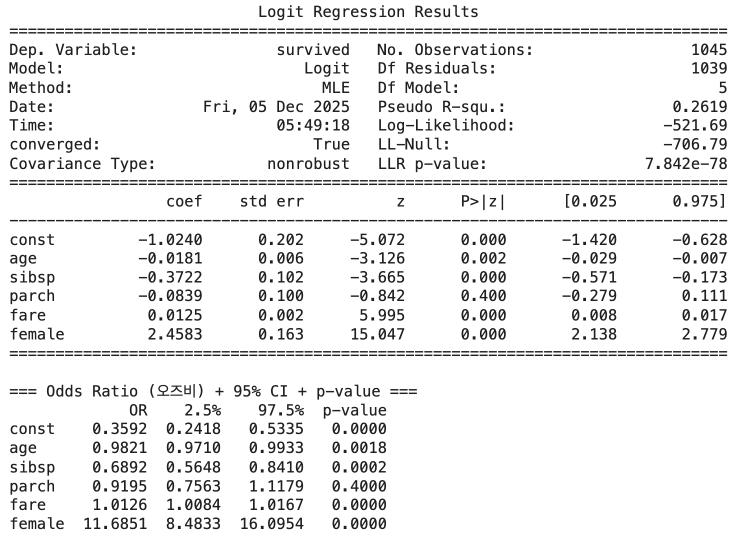 날개길이와 체중은 계수 크기가 매우 작고 오즈비는 1.01 수준으로, Adelie 구분에서는 상대적으로 영향력이 낮다. 정리: Adelie는 ’짧고 깊은 부리’라는 조합이 결정적으로 구분되는 특징이며, 체중·날개길이는 판별력이 상대적으로 작다.