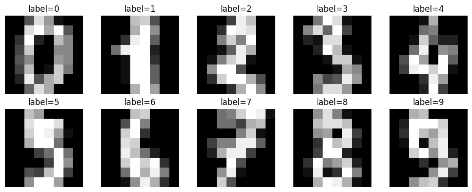 각 작은 패널(예: label=0, label=1, …, label=9)은 숫자 클래스별로 관측치 1개씩을 골라 보여준 것이다. (코드에서 idx = np.where(y==digit_label)[0][0]로 해당 숫자 라벨 중 ’첫 번째 샘플’을 선택한 결과이다.)