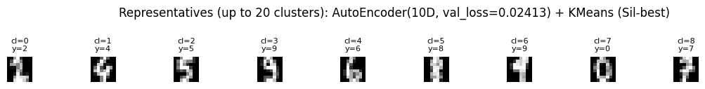 AutoEncoder(10D)+KMeans는 K=9로 선택됐다. silhouette를 기준으로 보면, 임베딩 공간에서 가장 “군집 간 간격이 깔끔해 보이는 K”가 9였다는 뜻이다. 여기서 중요한 직관은, 오토인코더가 픽셀을 그대로 쓰지 않고 “숫자 모양을 설명하는 핵심 요약 좌표”로 눌러 담아 주었다는 점이다.