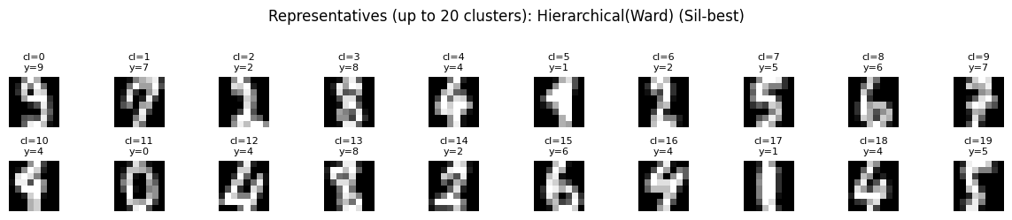 “잘게 나누면 덜 섞인다”는 효과가 그대로 반영된 것이다. ARI와 NMI도 가장 높아서, 결과적으로 숫자 라벨과의 정렬이 가장 잘 맞는다. 다만 silhouette가 낮다는 것은, 이렇게 만들어진 20개 덩어리가 내부적으로 아주 멀리 떨어져 있다기보다는, 가까운 덩어리들을 촘촘히 나눈 형태일 수 있음을 시사한다.
