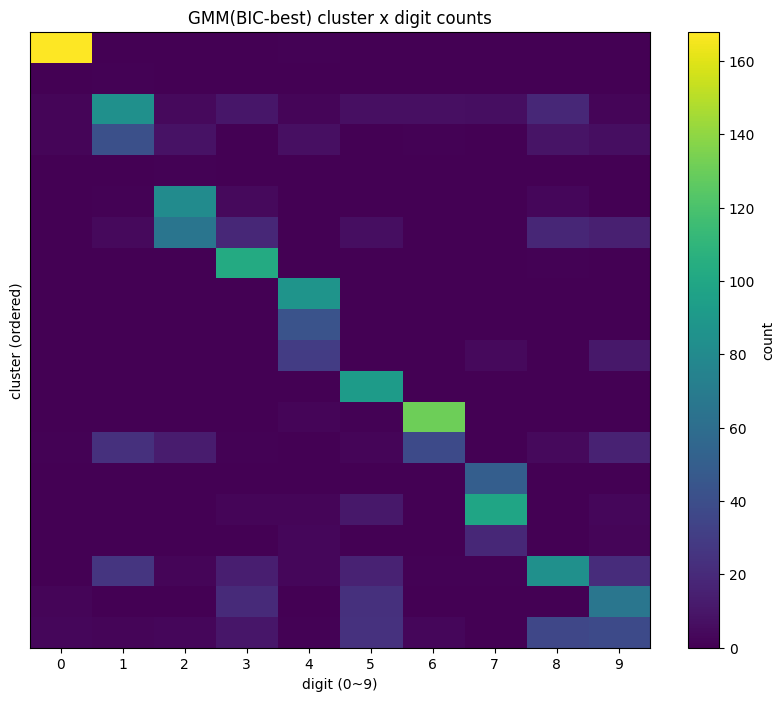 이 코드는 Digits 데이터에 대해 Gaussian Mixture Model(GMM)을 적합하여 군집을 수행하고, 군집 수 (K)와 공분산 형태(covariance type)를 바꿔가며 AIC/BIC로 최적 조합을 선택한 뒤, 선택된 모형의 군집 성능을 외부지표(ARI/NMI)로 요약하고 AIC/BIC 곡선을 시각화하는 절차이다.