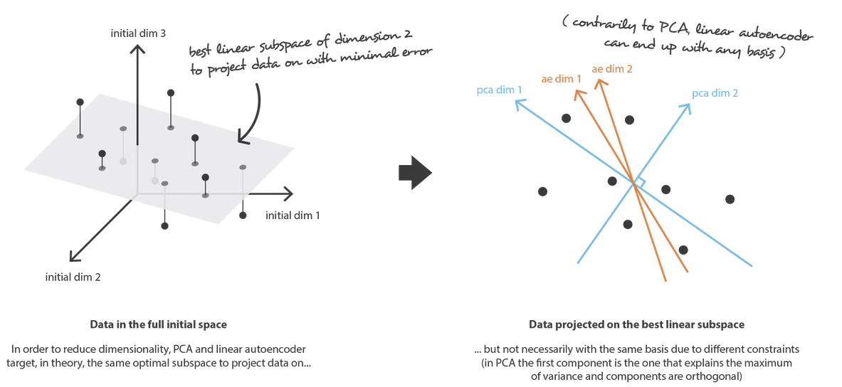 \[\max_{W^{\top}W = I}Var(XW) \leftrightarrow \min_{W} \parallel X - XWW^{\top} \parallel_{F}^{2}\]