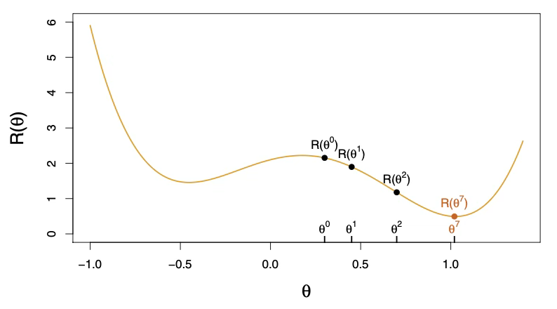 2. 목적함수가 더 이상 감소하지 않을 때까지 반복한다. (a) \(\theta\)의 작은 변화 \(\delta\)를 찾아 \(\theta^{t + 1} = \theta^{t} + \delta\)가 목적함수를 감소시키게 한다. 즉 \(R(\theta^{t + 1}) < R(\theta^{t})\)가 되게 한다. (b) \(t \leftarrow t + 1\).