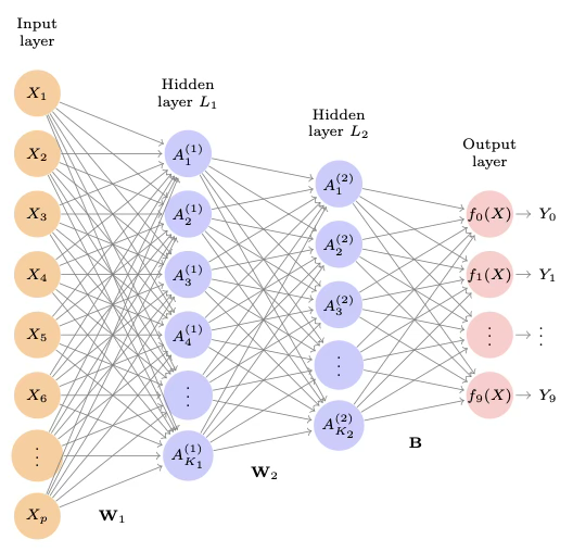 또한 \(h_{\ell}^{(2)}(X),w_{kj}^{(1)},w_{\ell k}^{(2)}\)처럼 위첨자 표기를 추가로 도입했는데, 이는 활성값과 가중치(계수)가 어느 층에 속하는지를 나타내기 위해서이다(여기서는 2층). \(W_{1}\)은 입력층에서 첫 번째 은닉층 \(L_{1}\)로 연결되는 전체 가중치 행렬을 뜻한다. 이 행렬은 \(785 \times 256 = 200,960\)개의 원소를 갖는데, 절편(또는 바이어스) 항을 포함해야 하므로 784가 아니라 785가 된다.