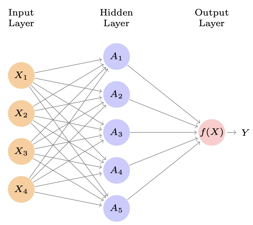 위 그림은 은닉층이 하나인 신경망. 은닉층은 입력 \(X_{1},X_{2},\ldots,X_{p}\)의 선형결합에 비선형 변환을 적용하여 활성값 \(A_{k} = h_{k}(X)\)를 계산한다. 따라서 \(A_{k}\)는 직접 관측되는 값이 아니다.