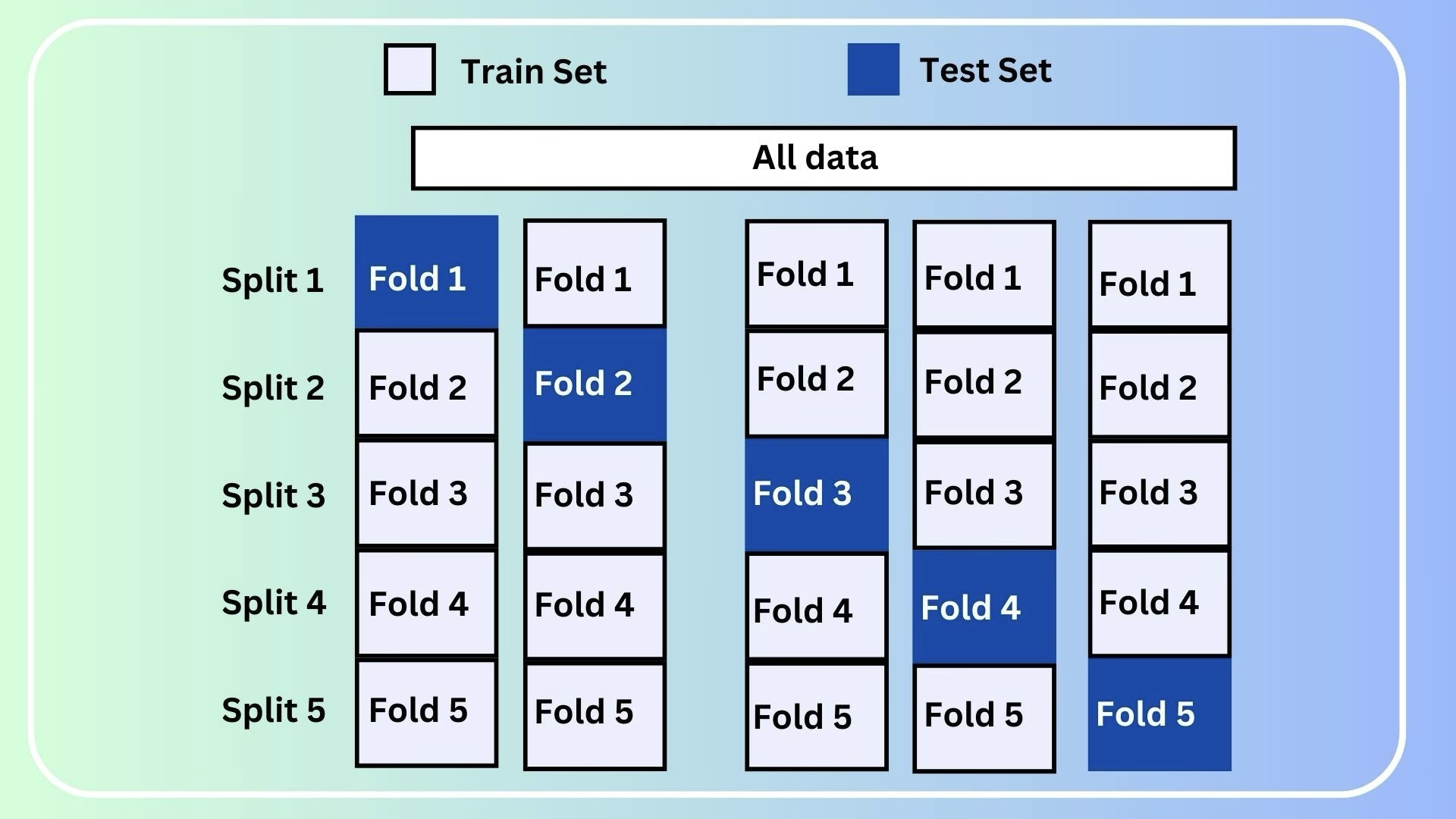 K-fold 교차검증에서는 데이터를 K개의 부분집합으로 나눈다. 각 단계에서 하나의 fold를 테스트 데이터로 사용하고, 나머지 K-1개를 사용해 모델을 학습한다. 이를 K번 반복하여 성능을 평가한다.